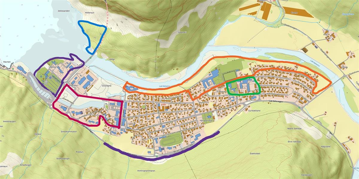 - Oransje område (Villakssenteret – Lærdalsøyri skule – Hanseskogen): Skulen