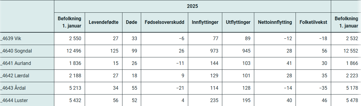 Også Aurland kommune hadde svært god folketalsutvikling i 2025. Statistikken for Luster og Sogndal syner også god folketalsauke, medan det var noko nedgang i Årdal og Vik: