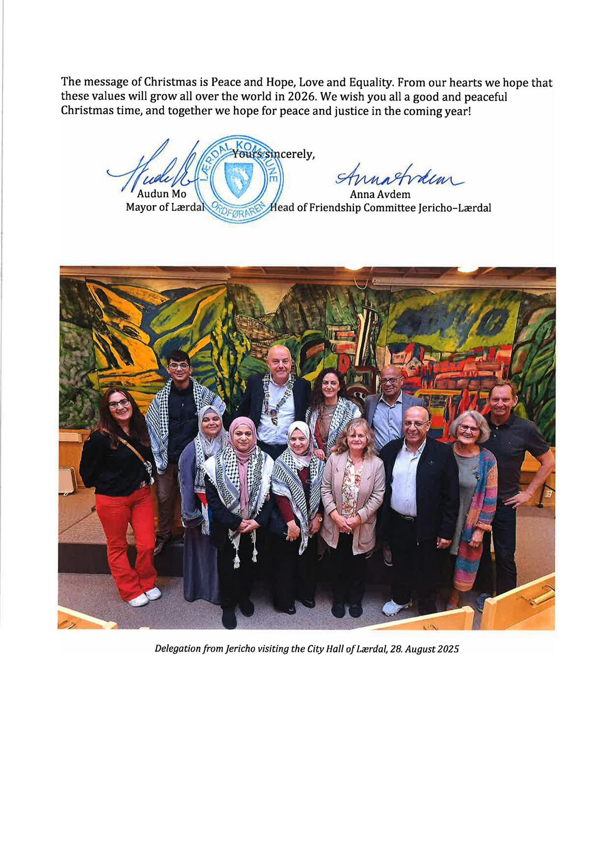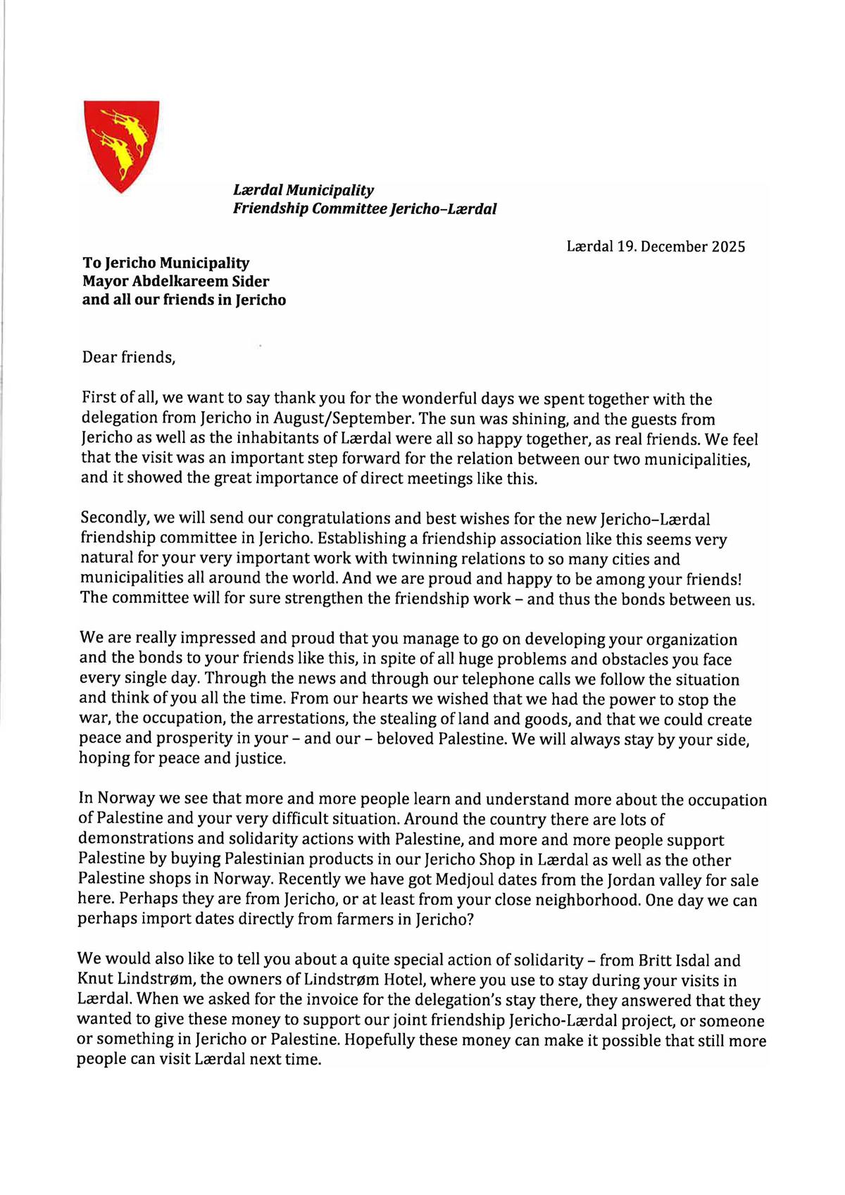 Når høgtida nærmar seg og eit nytt år ligg framfor oss, sender me hjartelege helsingar frå den gamle byen Jeriko, byen til månen og sola, historia og ei uthaldande menneskeleg ånd. Me ønskjer dykk fredelege høgtider og eit nytt år fylt med tryggleik, varme og stille håp. Me sender desse ønska med djup takksemd for vennskapen, solidariteten og det moralske motet de konsekvent har vist overfor byen og folket vårt.